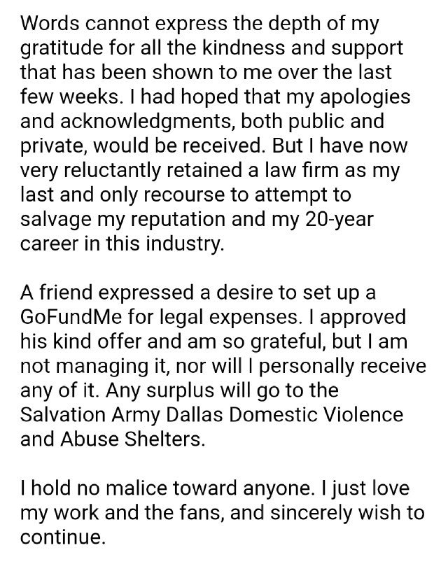 In risposta Vic Mignogna ha fatto la sua prima dichiarazione ufficiale dal suo discorso di scuse, affermando che il GoFundMe è legittimo, reale, smentendo l’ipotesi di frode.